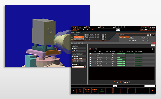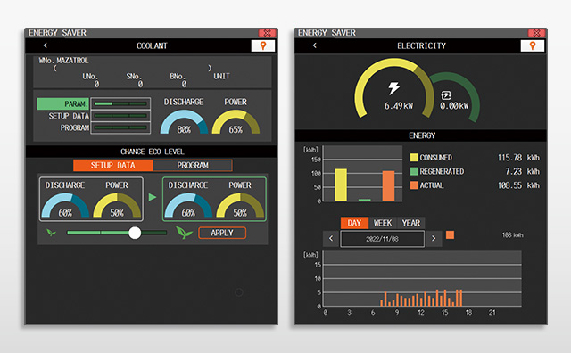 客户可以在 MAZATROL CNC 系统上直观地看到机床的能耗情况和由节能设备产生的再生功率。系统可以根据切削量控制冷却液的使用和其他设备的运行,达到降低功耗的效果。