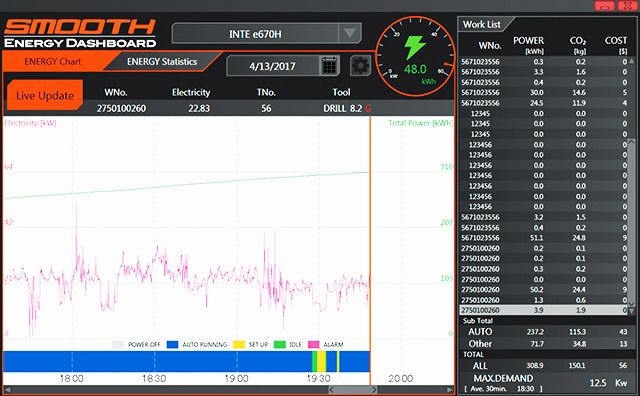 客户通过我们的监控软件 Smooth Monitor AX 的 Energy Dashboard Plus 功能,可以监控工厂内多台机床的功耗和二氧化碳排放情况。配备传感器后,还可以实现对其他制造商设备的监控,达到工厂整体节能的效果。