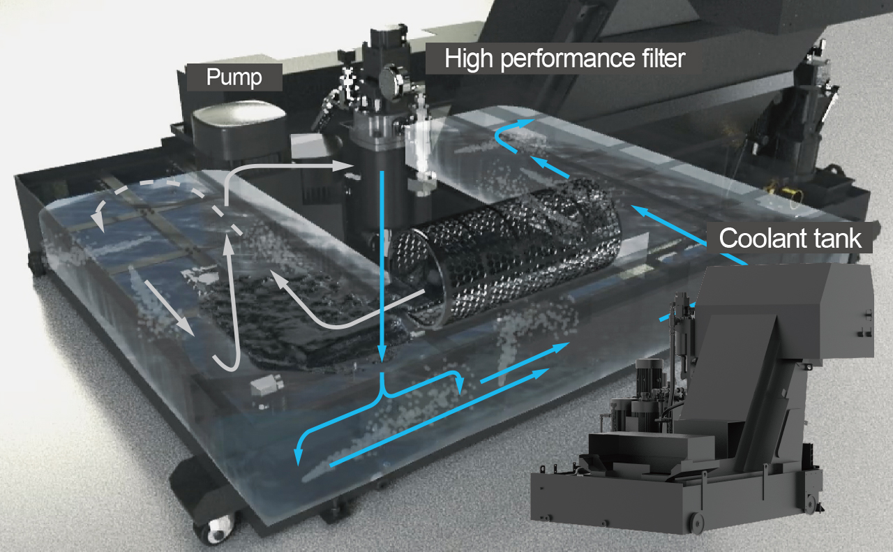 切屑和冷却液一并被吸取后,经由高性能过滤器,完成切屑和冷却液的分离。冷却液中的杂质去除率高达 99%。