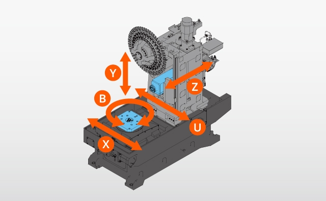 通过将立柱(U 轴)移动到 X 轴行程的一半,将工作台 X 轴移动到另一半,与其他具有相同工件能力的卧式加工中心相比,机床宽度大大减小。